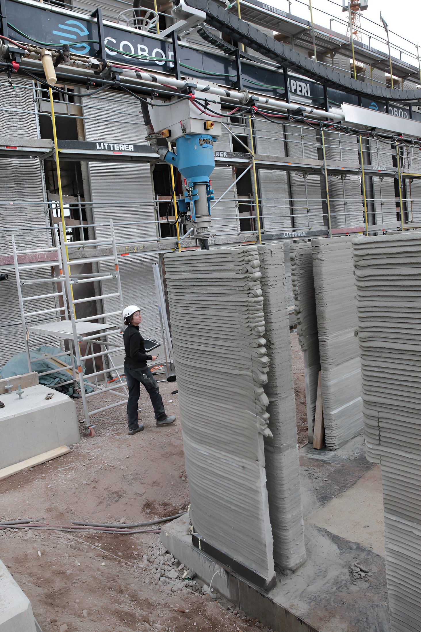 Työmaan toimintaa hallitsee kolme hiljaiseen kontrolli- ja täydennystyöhön keskittynyttä rakennusalan ammattilaista. Tulostuksen etenemistä tarkkailee Peri-Constructions GmbH -yhtiön projektipäällikkö, rakennusmestari Lena Zimmer.